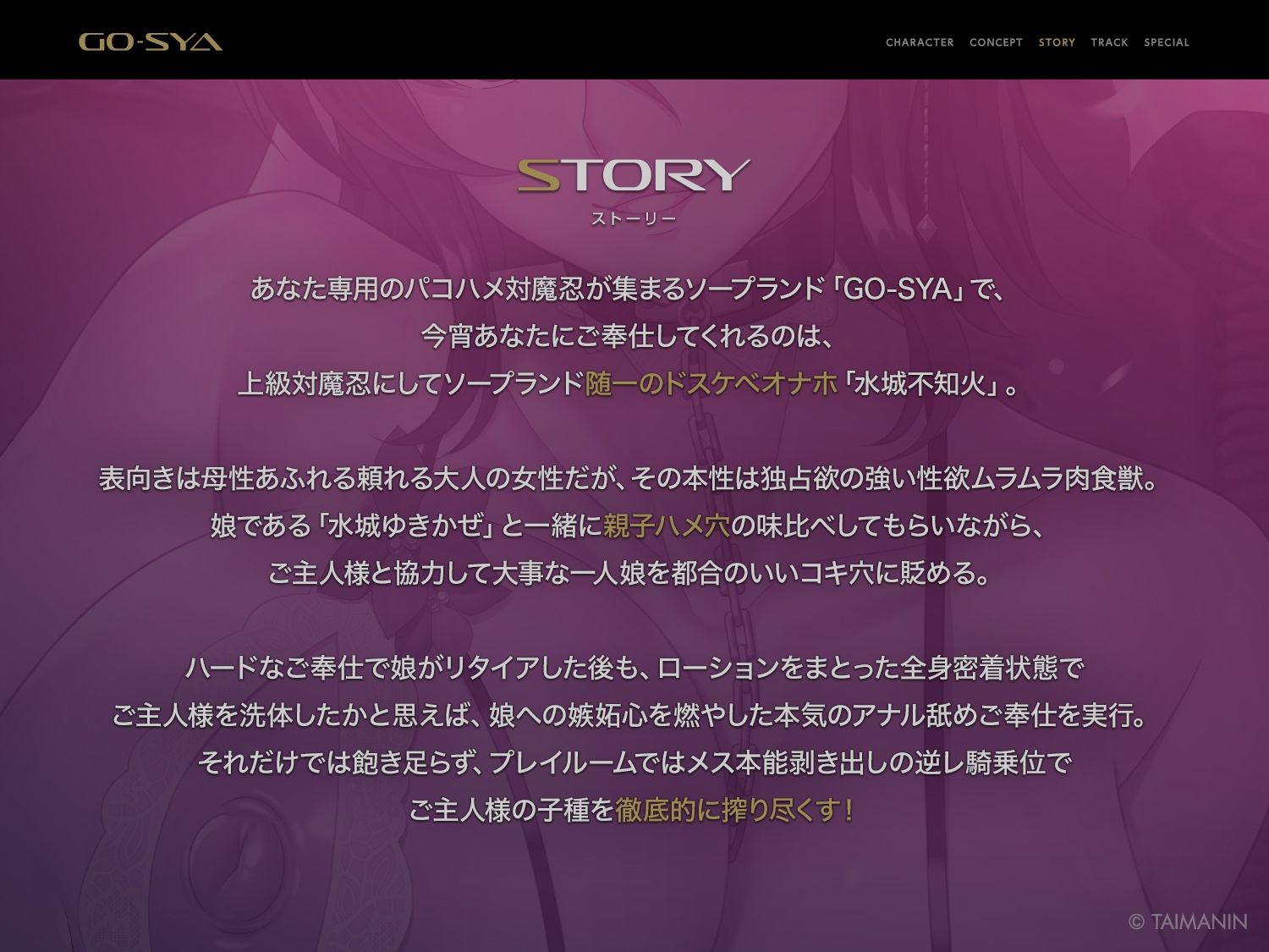 あなた専用のパコハメ対魔忍が集まるソープランド「GO‐SYA」で、今宵あなたにご奉仕してくれるのは、上級対魔忍にしてソープランド随一のドスケベオナホ「水城不知火」。