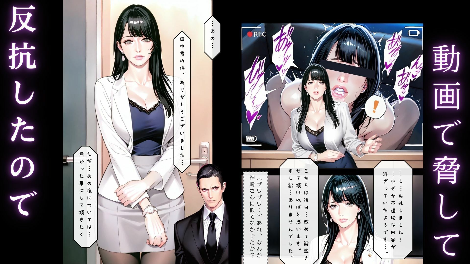 プレゼン中の恥辱シーン:神崎のセックス動画が会議室で投影され、役員や社員の前で晒される羞恥プレイ。